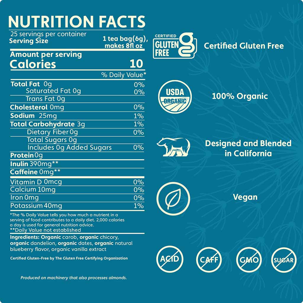If you love a gentle, soothing brew with a touch of natural sweetness, Teeccino Dandelion Blueberry Vanilla is a beautiful cup to settle into. This comforting blend combines roasted dandelion root with juicy blueberry notes and soft, creamy vanilla, creating a brew that’s both grounding and lightly indulgent.
