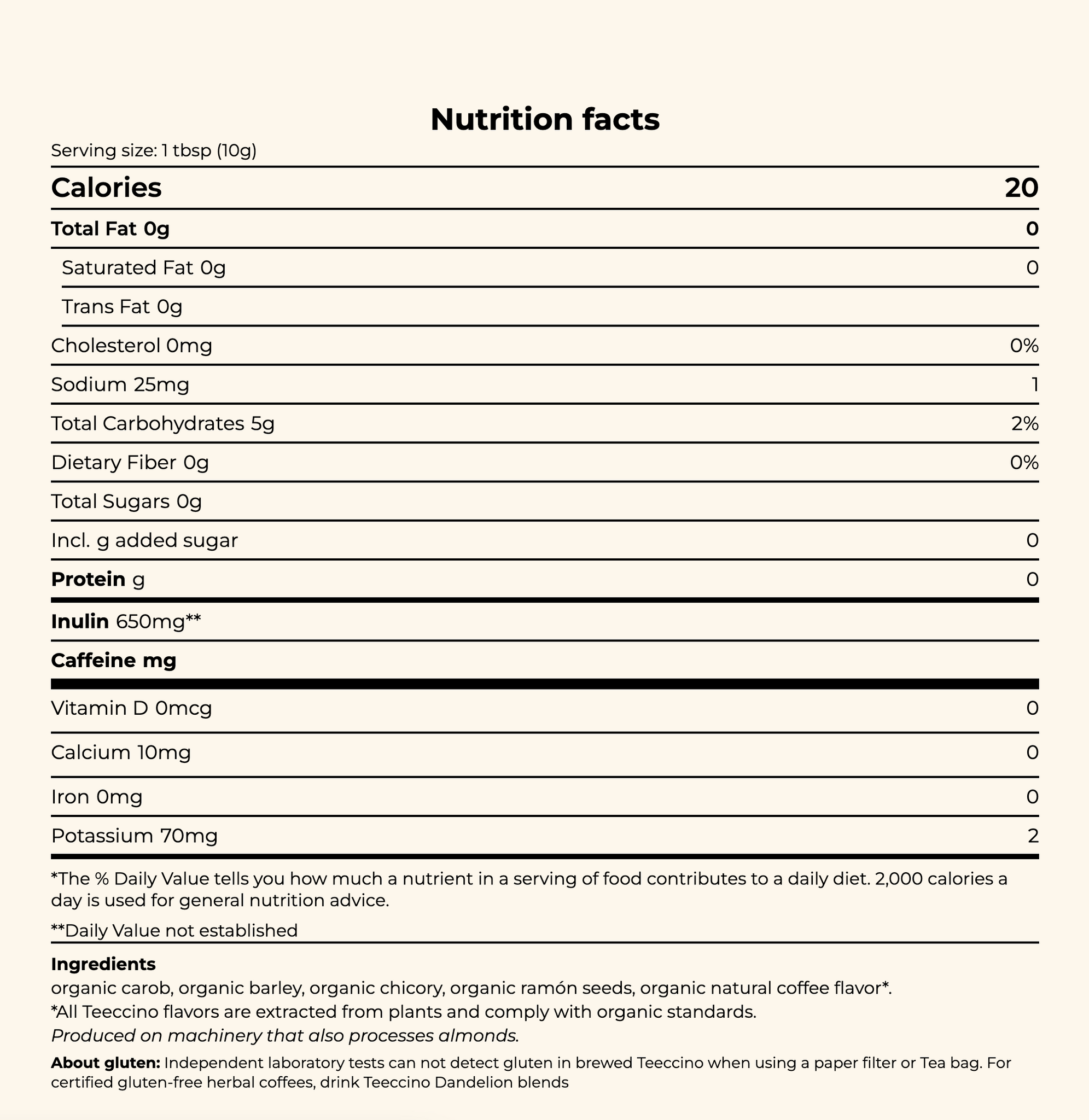 Ingredients: Organic carob, organic barley, organic chicory, organic ramon seeds, organic natural coffee flavour. *All Teeccino flavours are extracted from plants and comply with organic standards.