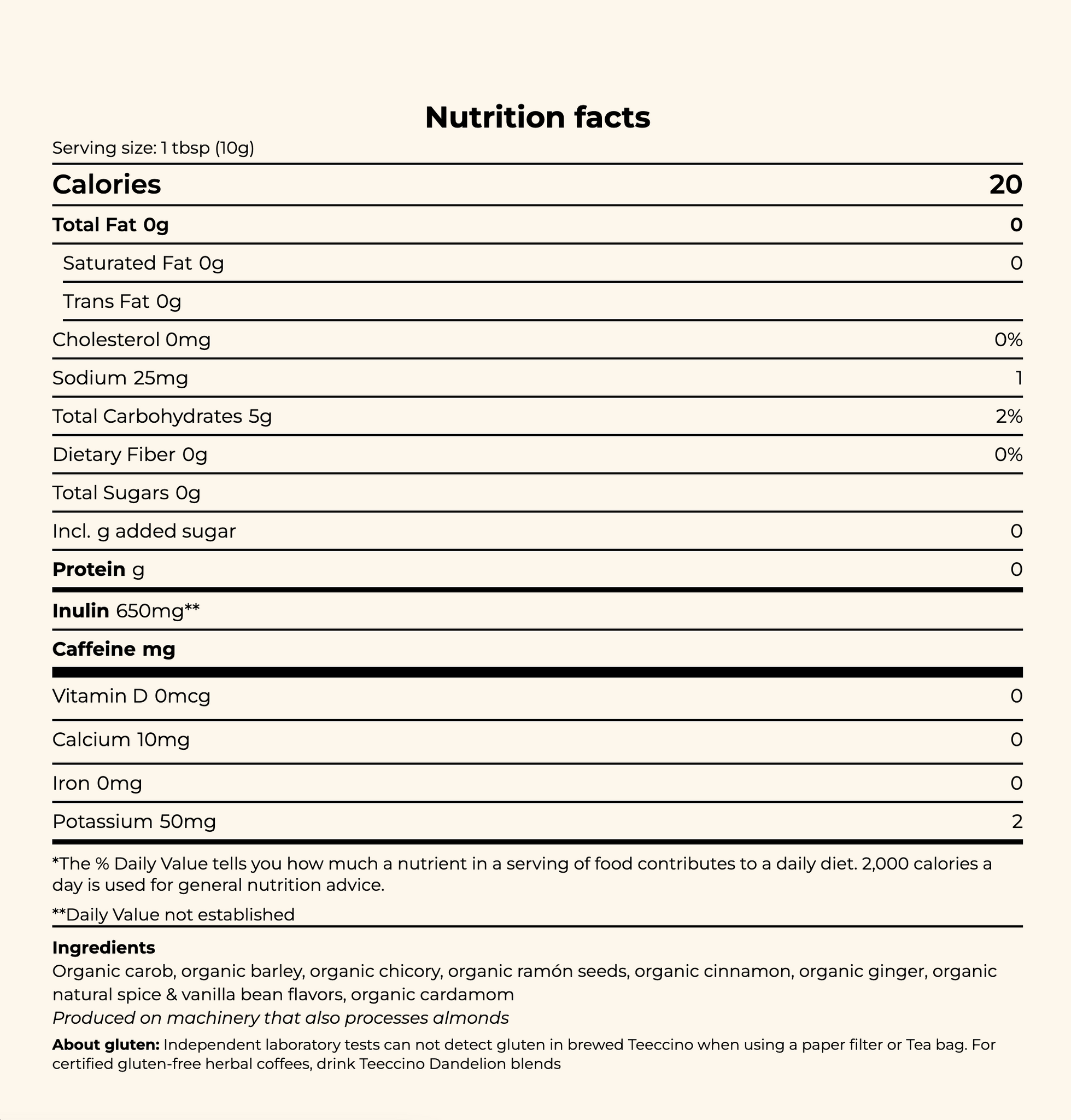 - Brewed Teeccino is gluten free as verified by independent laboratory tests
