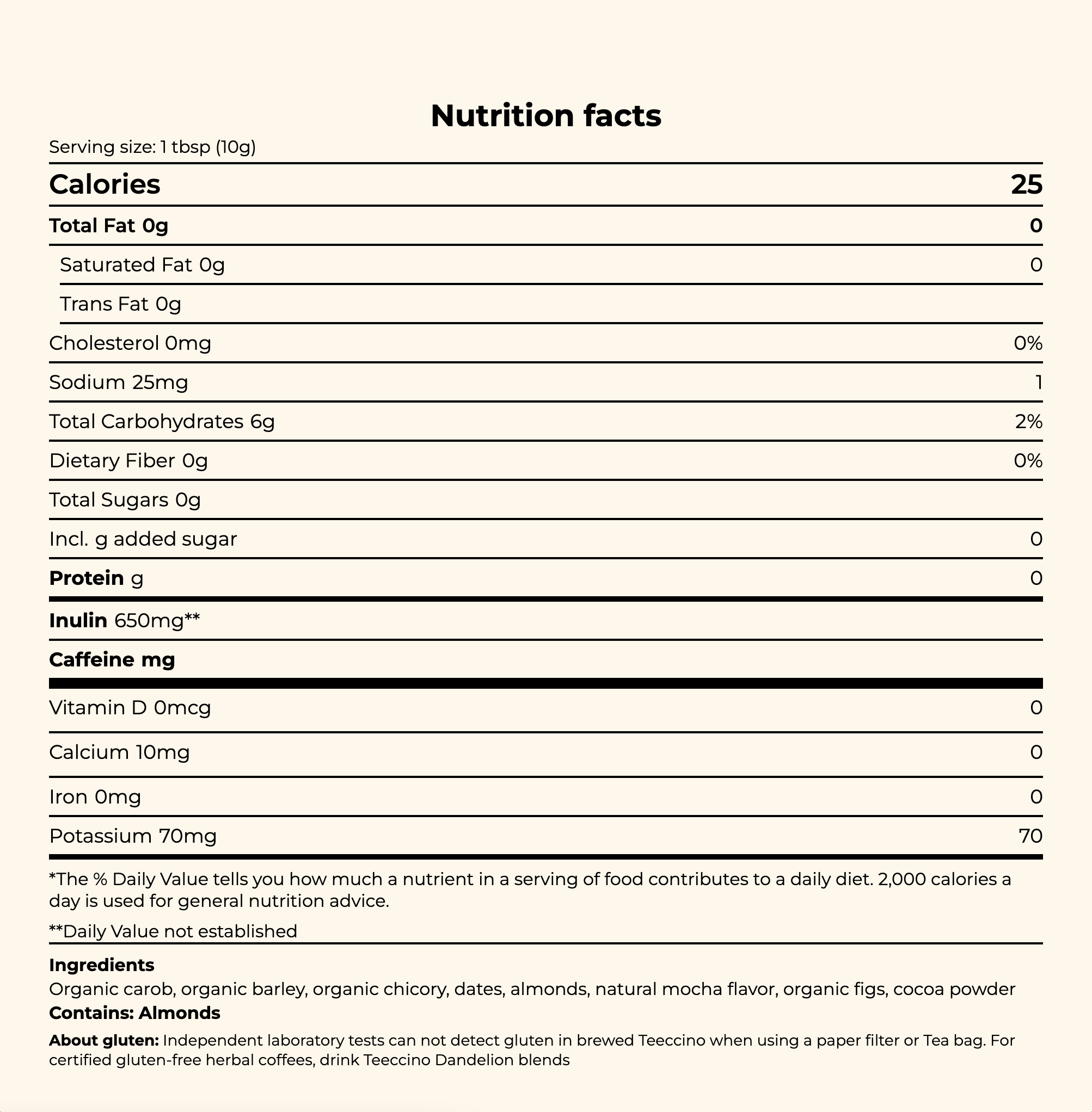 Ingredients: Organic carob, organic barley, organic chicory, dates, almonds, natural mocha flavour, organic figs, cocoa powder.
