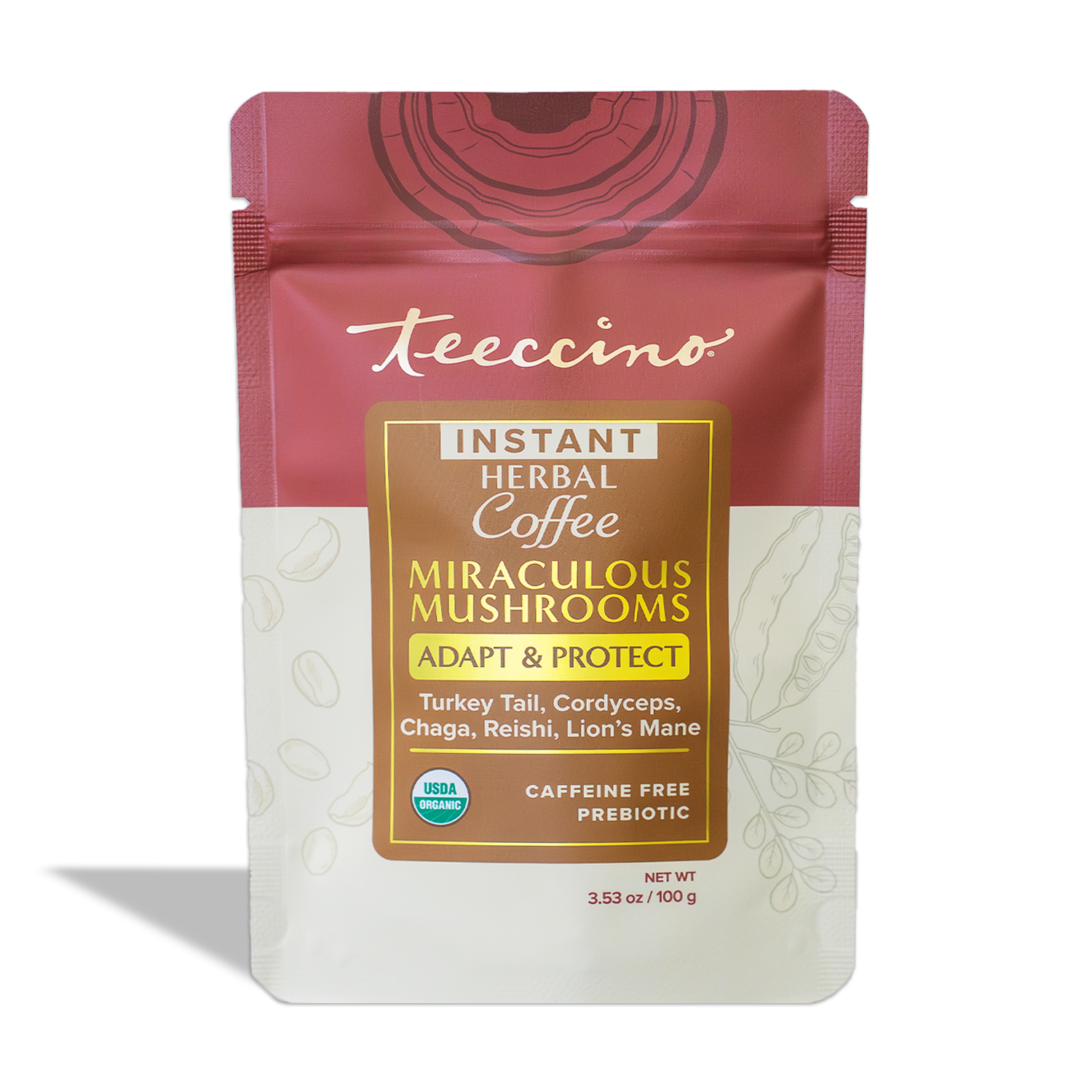 Enjoy the rich, roasted flavour of Teeccino with the nourishing benefits of adaptogenic mushrooms - now in a convenient instant format. Teeccino Instant Miraculous Mushrooms blends roasted chicory and carob with a carefully selected mix of functional mushrooms to support resilience, focus, and overall wellbeing, all without caffeine.
