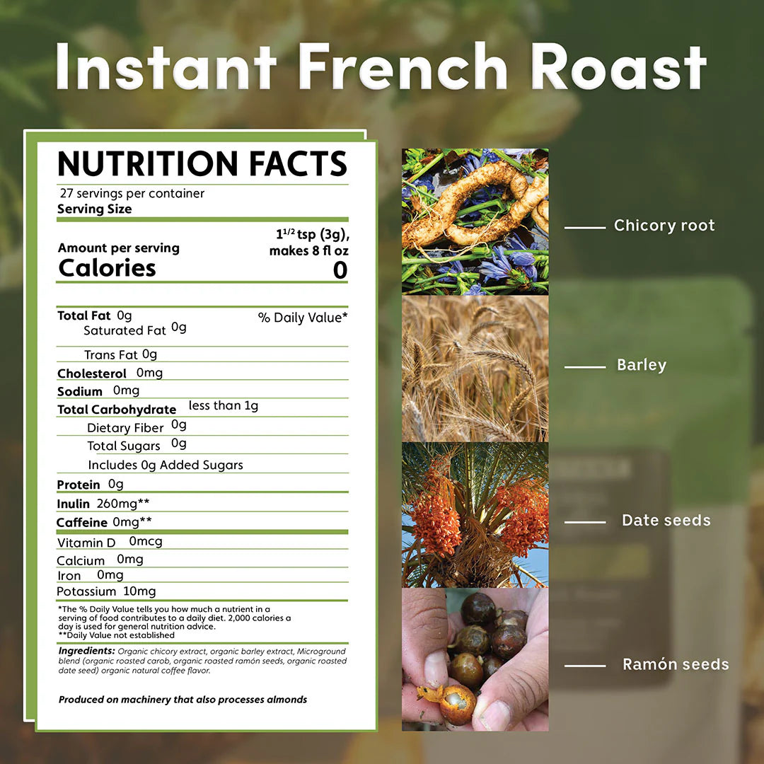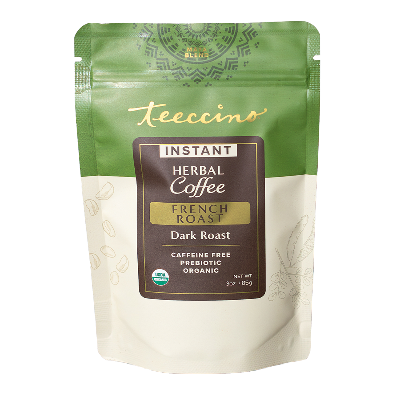 Enjoy the rich, dark flavours of a classic French roast - now in a convenient instant format. Teeccino French Roast Instant blends roasted chicory and carob with herbal botanicals for a smooth, full-bodied cup that’s naturally caffeine-free, low-acid, and gentle on the stomach.