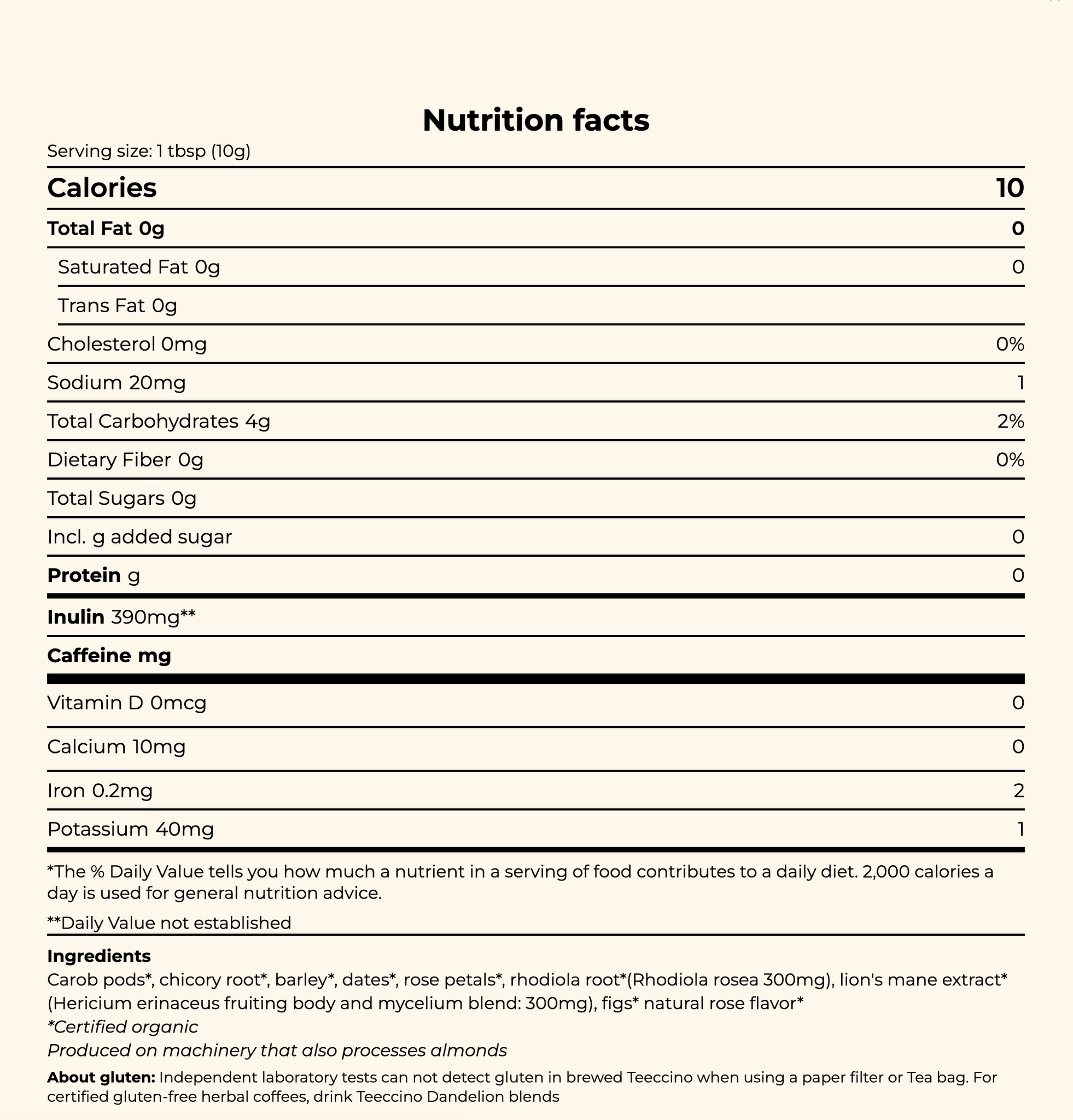 Ingredients: Carob pods, chicory root, barley, dates, rose petals, rhodiola root (Rhodiola rosea 300mg), lion's mane extract (Hericium erinaceus fruiting body and mycelium blend: 300mg), figs, natural rose flavour.