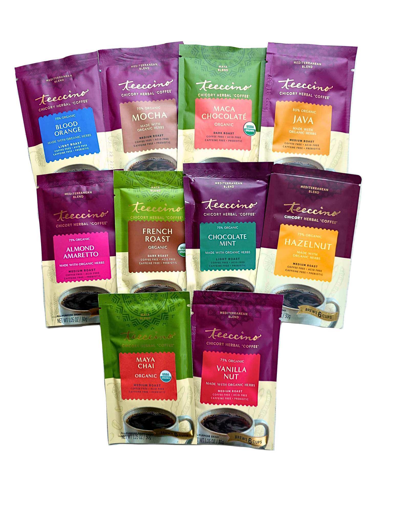 From smooth and nutty to bold, chocolatey, and bright, this sampler lets you explore the full spectrum of Teeccino’s naturally caffeine-free, acid-free, and prebiotic blends.